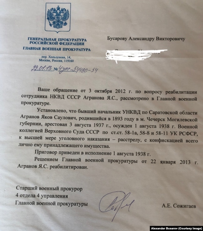 "Odlukom ureda glavnog vojnog tužitelja od 22. januara 2013. godine, Agranov, Ja. S. je rehabilitiran“, pisalo je u dokumentu.