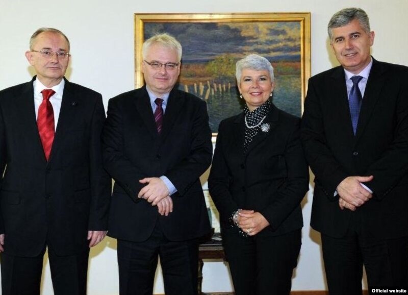 Predsjednik HZZ 1990 Božo Ljubić, predsjednik Hrvatske Ivo Josipović, premijerka Hrvatske Jadranka Kosor i predsjednik HDZBiH Dragan Čović tijekom susreta u Zagrebu, 12. siječnja 2011.
