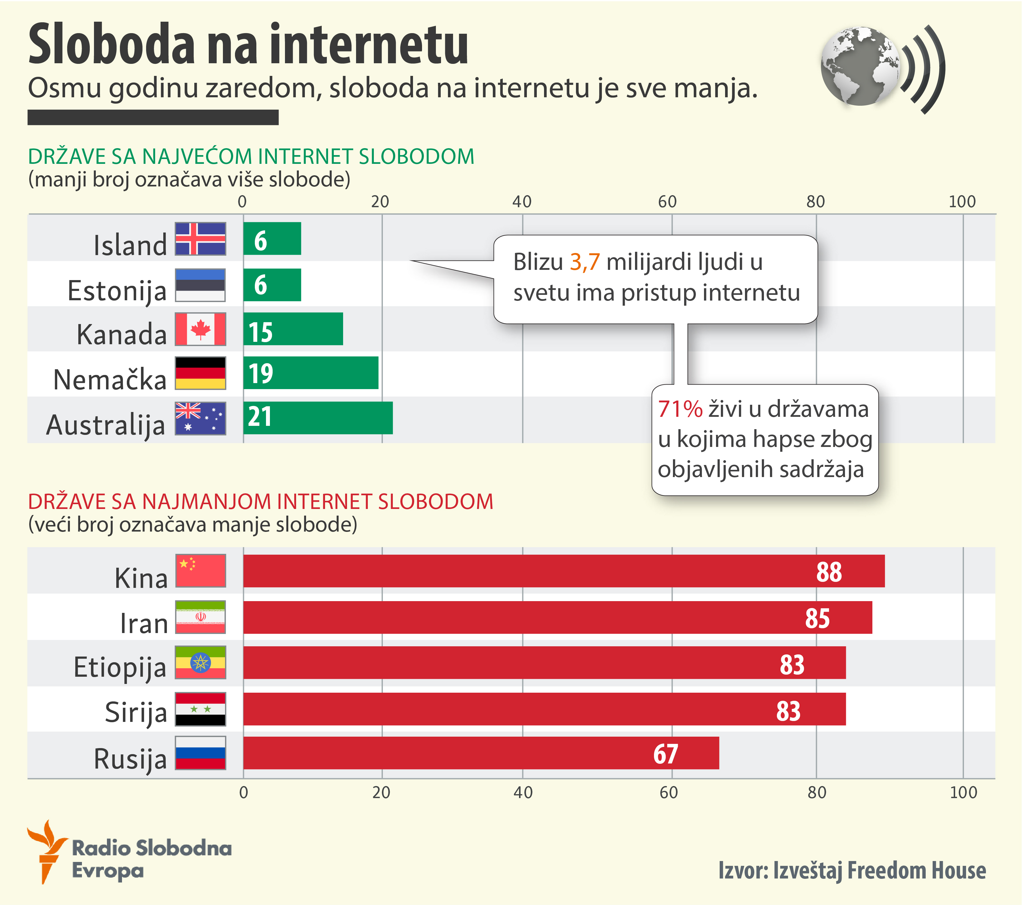Istraživanje internet sloboda, Freedom House je sproveo u 65 država koje čine 87 odsto internet korisnika u svetu. Najveću kontrolu nad ličnim podacima građana i ove godine sprovodi Kina.
