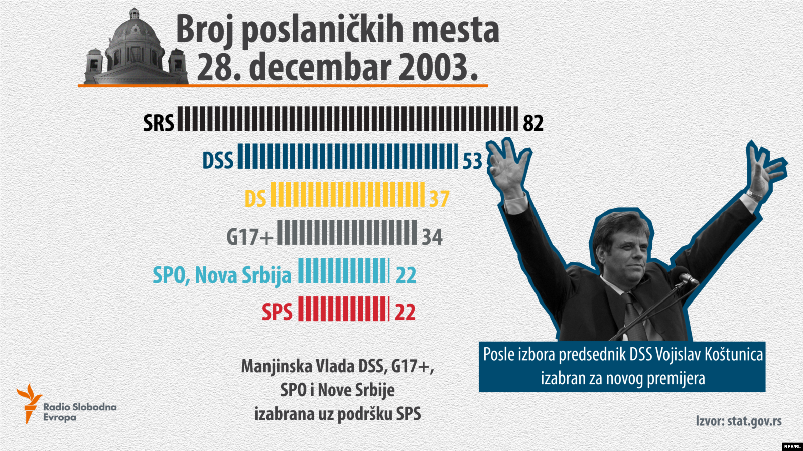 Do tada, godinama vladajuća Socijalistička partija Srbije osvojila je 37 mandata a njihov tadašnji koalicioni partner, Srpska radikalna stranka 23. U Parlament je ušla još samo Stranka srpskog jedinstva sa 14 mandata. Sve ostale stranke bile su ispod cenzusa, uključujući i Jugoslovensku levicu koja je sa SPS na vlasti bila do 5. oktobra 2000. Bez mandata ostao je i Srpski pokret obnove, jedna od retkih opozicionih stranaka koja se nije priključila DOS-u.