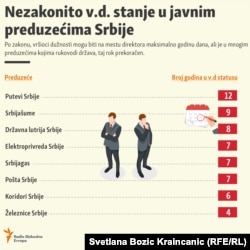 To znači da direktori nisu izabrani na konkursu, već je vršioce dužnosti imenovala Vlada, koju je izglasala u Skupštini SNS sa koalicionim strankama. Po Zakonu, vršioci dužnosti mogu biti maksimalno godinu dana, ali je u mnogim preduzećima taj rok prekoračen.