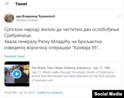 Poslanik SNS-a Vladimir Đukanović u izjavi za Radio Slobodna Evropa (RSE) kaže da se "neće ograditi" od čestitke "dana oslobođenja Srebrenice" i zahvalnice "generalu Ratku Mladiću na briljantno izvedenoj vojničkoj operaciji ’Krivaja 95’", koju je napisao na svom Tviter nalogu.