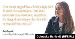 "Kada sam upisivala fakultet roditelji su mi rekli – budi dobar student kako bi sjutra mogla da odeš odavde. Taj 'savjet' većinu nas prati tokom cijelog školovanja", kaže za RSE Anđela Bujić, studentkinja FPN u Podgorici.