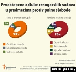 "U slučajevima od 100 žena i djevojčica koje su doživjele seksualno nasilje, dva posto počinilaca je kažnjeno, i od toga samo jedan je dobio kaznu zatvora", navodi se u Studiji o seksualnom nasilju nad ženama i djecom u Crnoj Gori iz 2020. godine koju su objavile Sigurna ženska kuća, SOS telefon za žene i djecu žrtve nasilja Nikšić i Prima.