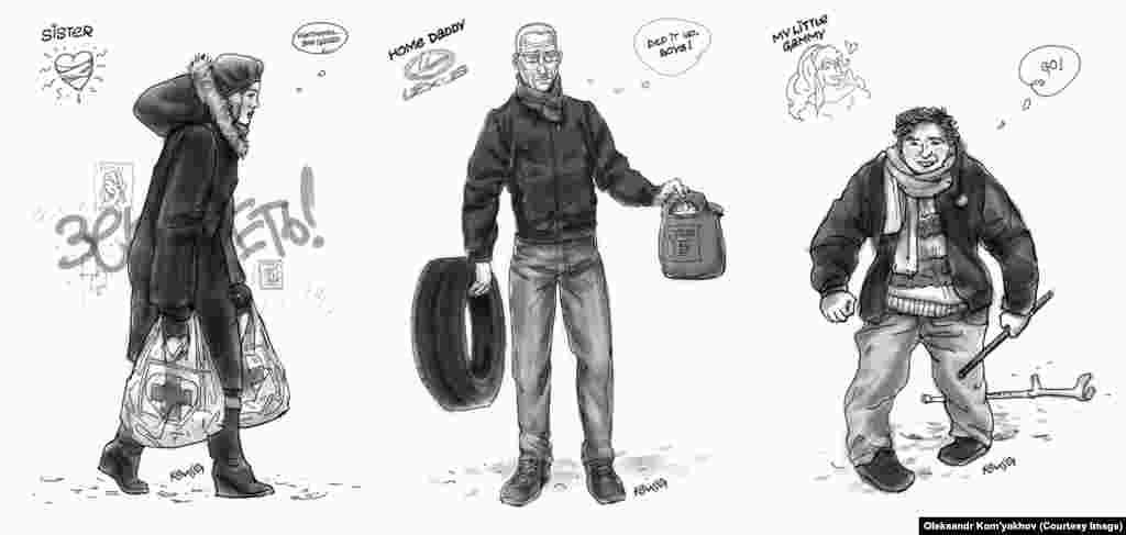 Oleksandr Homjekhov (Oleksandr Kom'yakhov) i Andrij Prijmačenko (Andriy Pryimachenko)., jedan umetnik i novinar zajedno su stvorili čitavu galeriju upečatljivih, životnih portreta Ukrajinaca koji svom snagom podržavaju proteste.