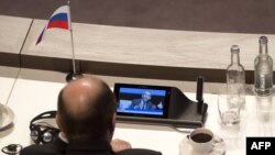 FOTO: Član ruske delegacije prati na monitoru izlaganje predsednika SAD Baraka Obame tokom samita posvećenog nuklearnoj bezbednosti u Hagu.