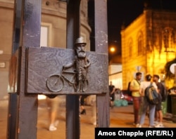 U blizini stajališta za bicikle ispred sinagoge u ulici Dohani (u pozadini desno), ovaj bronzani reljef prikazuje mađarskog Jevrejima Teodora Hercla, osnivača modernog cionizam.
