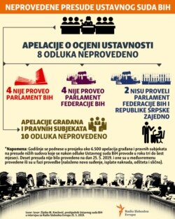 Po apelacijama za ocjenu ustavnosti, do sada nije provedeno osam odluka Ustavnog suda Bosne i Hercegovine.