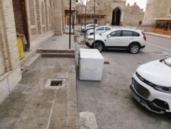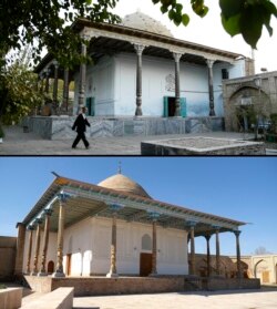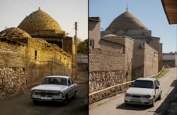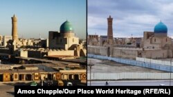 Medresa Abdišukur Agalik iz 19. stoljeća u središtu Šakrisabza iz 2007. (lijevo) i 2020 godine. Obnova medrese uključivala je suvremene građevinske radove koji zamjenjuju stare zidove od opeke. Čini se da je kupola u potpunosti obnovljena.