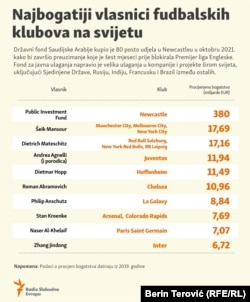 RB Sports & Media i PCP Capital Partners imaju po 10% udjela u Newcastlu kao dio preuzimanja, prenosi Goal.com. Procjenjuje se da Bin Salman ima lično bogatstvo od oko 17,6 milijardi dolara.