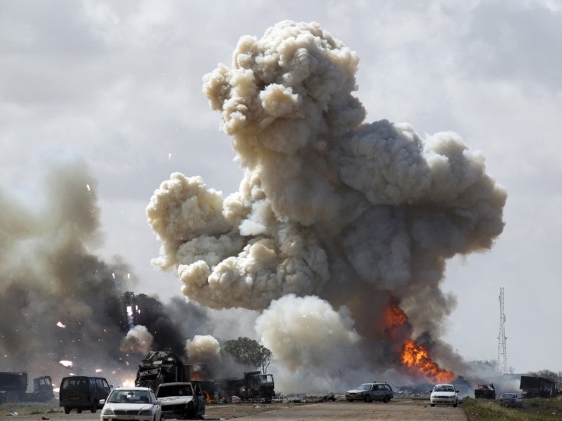 Rezolucija 1973 Ujedinjenih nacija poziva na potpuni prekid napada na civile, uvodi zonu zabrane leta nad Libijom i dozvoljava napade da bi se zaustavile Gadafijeve snage.