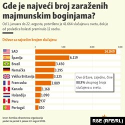 Zaključno sa 22. avgustom u svetu je zabeleženo 41.664 slučajeva majmunskih boginja, a 12 osoba je preminulo.