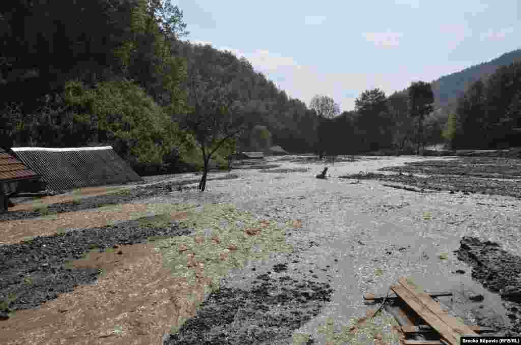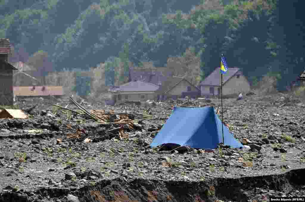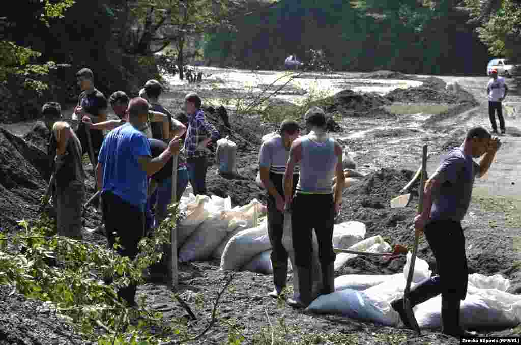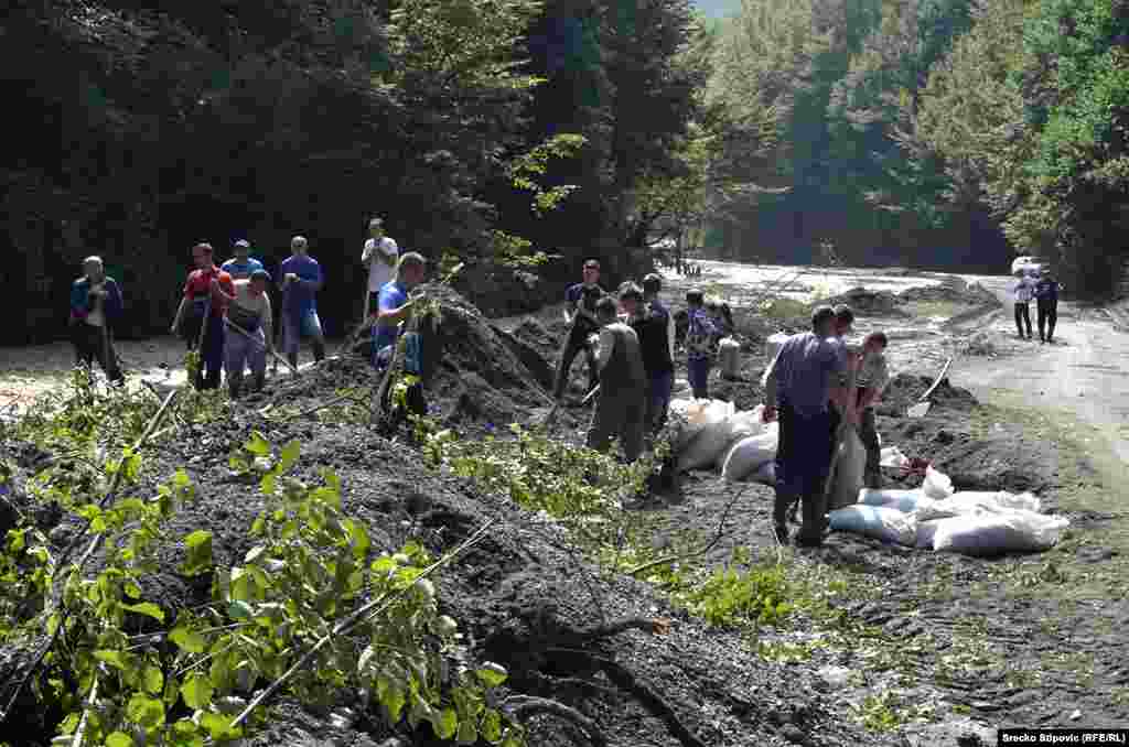 Više od 200 mještana Željeznog Polja kod Žepča u centralnoj Bosni u subotu je pravilo nasipe uz rijeku Željeznicu koja je zbog oblinih kiša opet poplavila naselje Ćole a pokrenula i klizišta. Uz pomoć strojeva put od Žepča do Željeznog Polja sada u funkciji. Mnogi mještani noćima ne spavaju u svojim kućama zbog pomjeranja klizišta, a više nisu sigurni ni oni koji su smještaj pronašli pod šatorom. RSE/Foto: Srećko Stipović