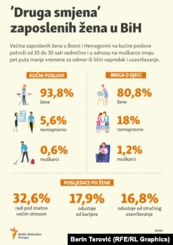 "Tu se ne misli samo na kućne poslove, pospremanje, nego kompletno na brigu o svim članovima porodice, organizaciju novog načina života, sve to što je zapravo pandemija donijela sa sobom. Bilo je stvarno jako mnogo iskustava", kaže Lejla i dodaje kako je da je svaka ispitana žena bila dodatno opterećena kućnim obavezama.